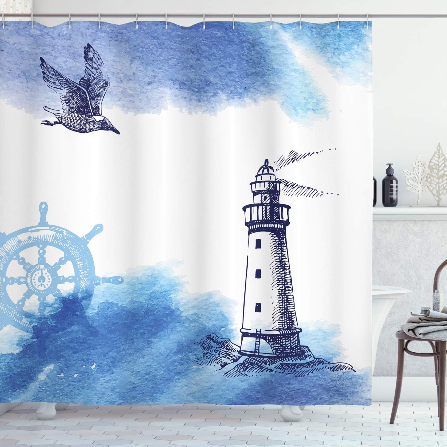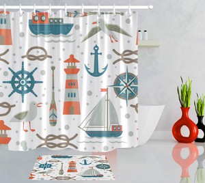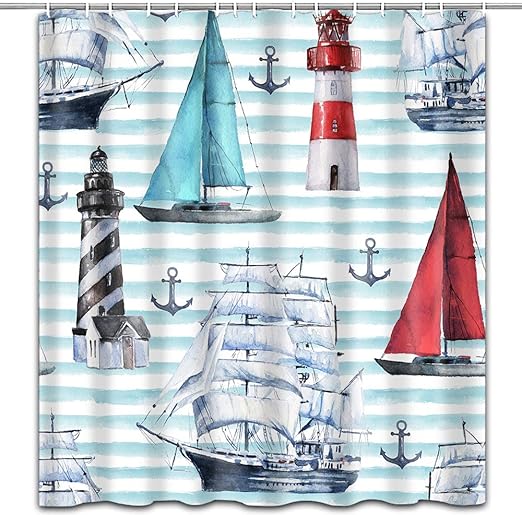 Nautical Waterproof Shower Curtain Marine Sailboat Lighthouse
